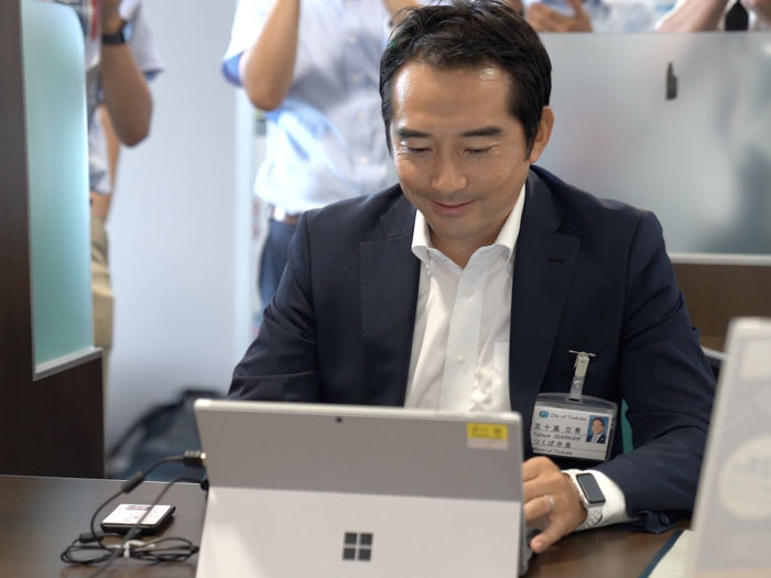 ネット投票するつくば市の五十嵐立青(たつお)市長。「つくばSociety 5.0社会実装トライアル支援事業」の最終審査で実証実験を行った