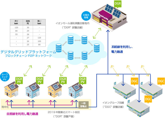 スマートハウス5軒を電線でつなぎ、常時電気を融通するための送受が行えるように管理。さらに、大型ショッピングモールやコンビニともネットワークでつなぎ、相互に電気を送り合う。その際、この電力融通の履歴・管理をブロックチェーンで行おうとしている。(参考:デジタルグリッド株式会社HP)
