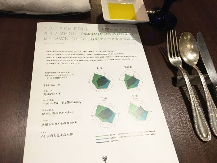 REALTAで使用されたメニュー表。2つのメニューの料理は同じだが、使う食材が違う。レーダーチャートで料理に使う食材の生産品質と流通品質の数値を示した