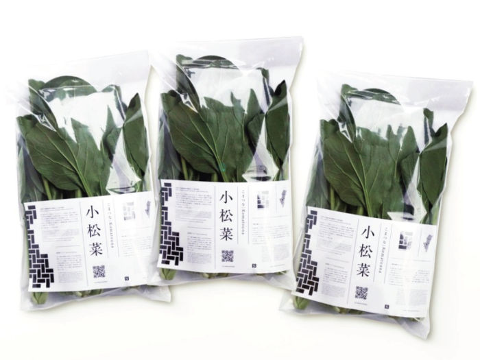 生産された野菜のパッケージイメージ。「小松菜」の下に履歴閲覧用のQRコードがある