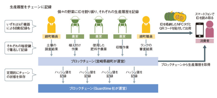 同プロジェクトでは、生産過程、土壌の調査結果、使用した肥料、流通経路といった農産物が消費者に届くまでのあらゆるデータを、綾町と、協働したエストニアの企業の両者が運営するブロックチェーン上に記録、管理した。こうすることで、両者のブロックチェーン上の記録を突き合わせることができ、情報の信頼性を担保しているという。
