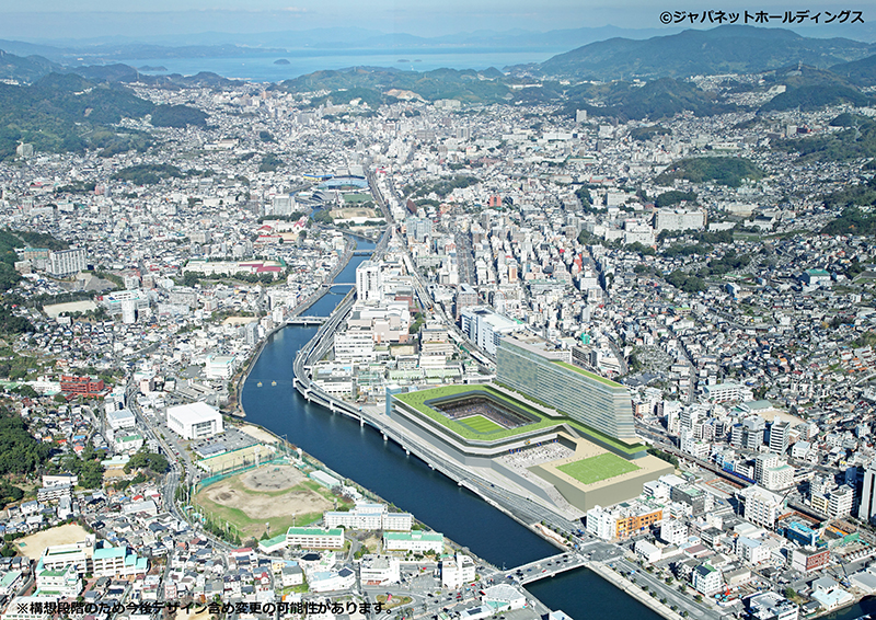 三菱重工業長崎造船所幸町工場跡地にジャパネットホールディングスが計画。スタジアムを中心にマンションやホテルを建設するという。完成予定は2023年