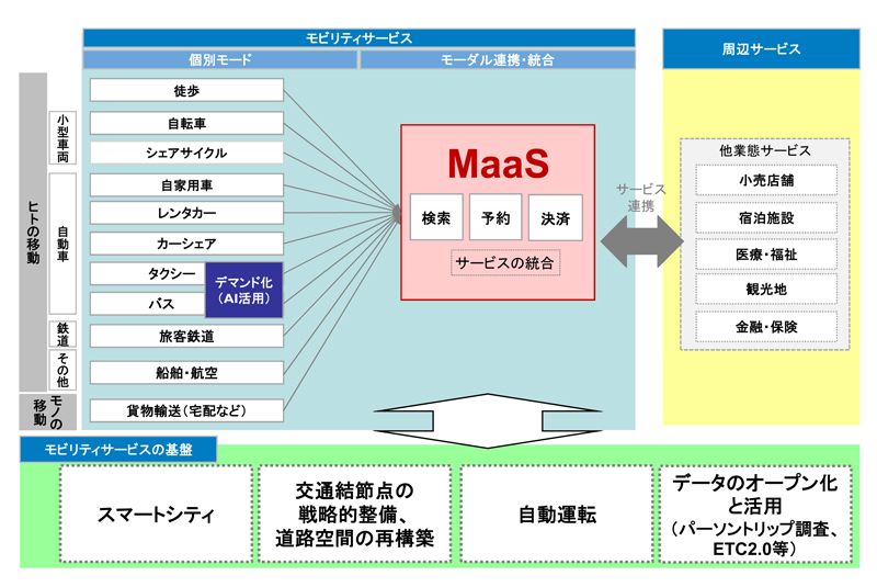 定義としては「ICT(情報通信技術)を活用して交通情報をクラウド化し、公共交通にかかわらず、マイカー以外のすべての交通手段による移動を一つのサービスとしてシームレスにつなぐ、新しい概念」のことだという。