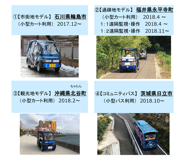 「市街地モデルとして石川県輪島市、過疎地モデルとして福井県永平寺町、観光地モデルとして沖縄県北谷町で、電動の小型カートを使った実験を行っています。また、小型バスを使った実験を茨城県日立市で実施しました」