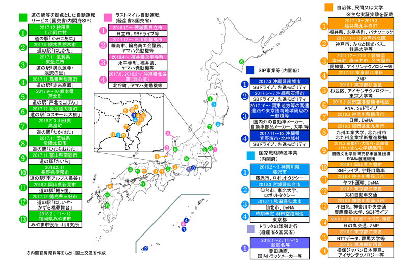 官民を問わず、全国各地で実施中の自動運転実証実験。ここで紹介したのは一部の実施例であり、ほかにも数多くの実験が行われている