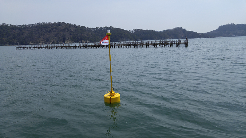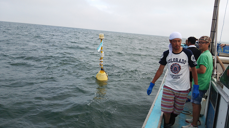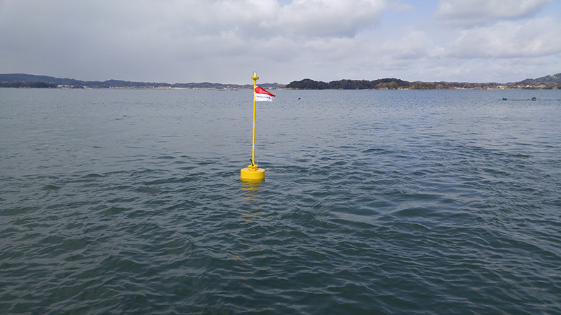 漁師の協力のもと、東松島の海に浮かんだユビキタスブイ