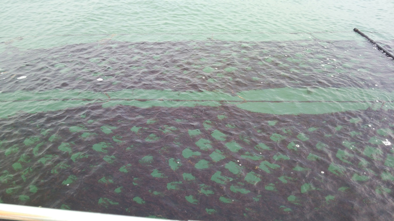 海面で育つ塩竃のノリ。水温管理と塩分濃度管理が発育に、ひいては収益にも影響することになる