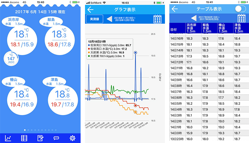 アンデックスが開発したアプリ「ウミミル」のトップ画面(左)とグラフ画面(中と右)。トップ画面右下の「83℃」が積算水温。これがトータルして600度を超えるとカキの抱卵時期となる。わざわざ海に出て海水温を図ることなく、自宅にいながらチェックできると漁師に評判とのこと