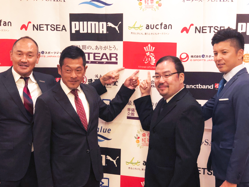 2018年9月に発足した「eスポーツジャパン」の記者会見の様子。岡山氏(左から2人目)をはじめ、ヘッドコーチとして参加する秋田豊氏(左)の姿も
