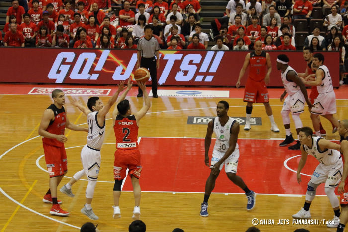B.LEAGUE CHAMPIONSHIP 2017-18セミファイナル対琉球ゴールデンキングス戦。ジェッツレッドに染まった船橋アリーナで、シュートを放つ富樫勇樹選手