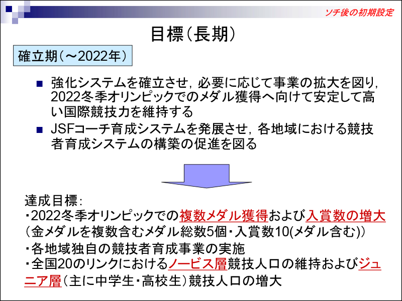 強化対策は就任から4年後の平昌五輪に向けた短期目標と、8年後に向けた長期目標が設定された