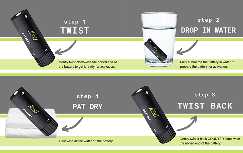 そのひと手間も、電池をひねって水の中に約1分間漬けるだけ、といたってシンプル。内部に水分が充填されることで、電池(電解質)を活性化する仕組みだ。