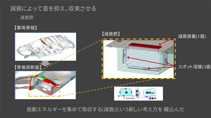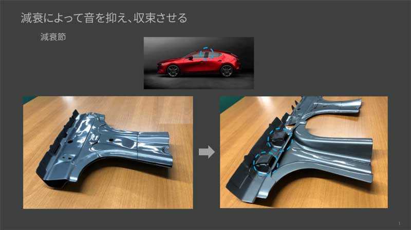 だがMAZDA3では、スポット溶接を3点とし、残る1点にあえて振動エネルギーを集める構造を採用。その1点に独自開発した特殊樹脂を緩衝材として配し、振動エネルギーを熱エネルギーに変換する“減衰節”とした。