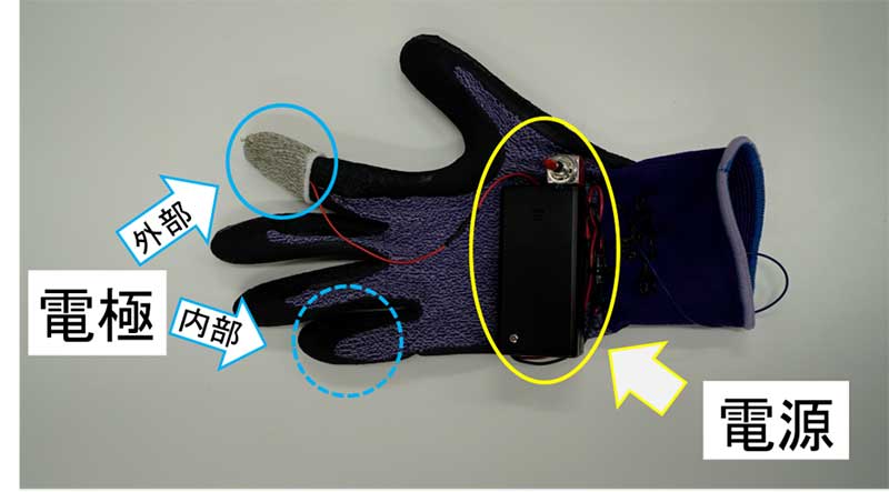 手袋の人差し指に電極が取り付けられており、金属製のスプーンやフォーク、コップなどを介して舌に電気味覚を与えることが可能。人差し指の位置で、電気のオンオフや電気味覚の強弱をつけることができるという。