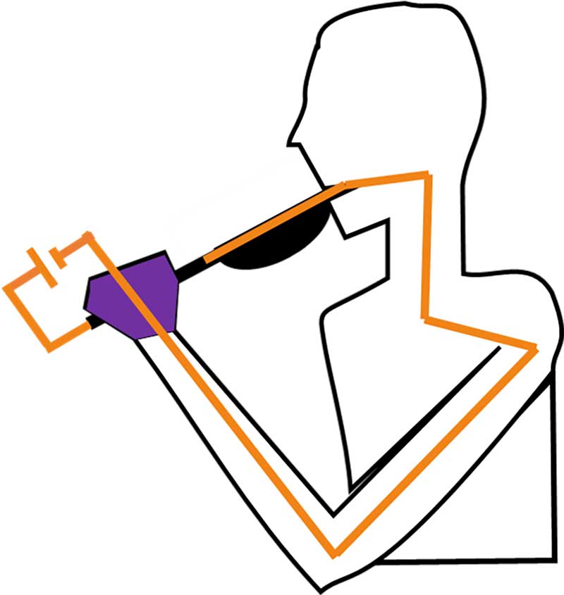 図のような回路によって電気味覚が与えられる。これは、電気の発生源がフォーク、または手袋でも同じ原理となる
