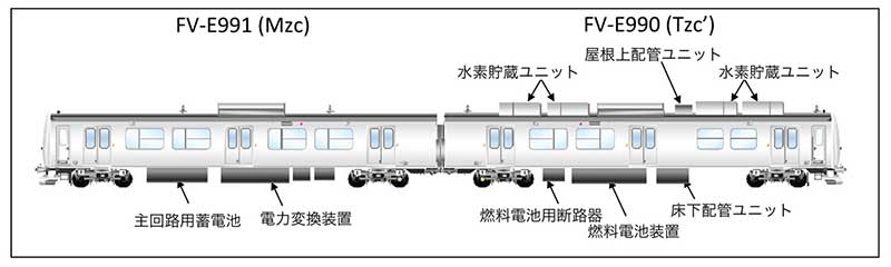 FV-E991系の構成は、走行用モーター(主電動機)付きのFV-E991形とモーターを持たないFV-E990形による2両1編成を予定。-10℃程度から起動可能な180kWの燃料電池(固体高分子型)と、25kWhの蓄電池を各2個ずつ搭載する。