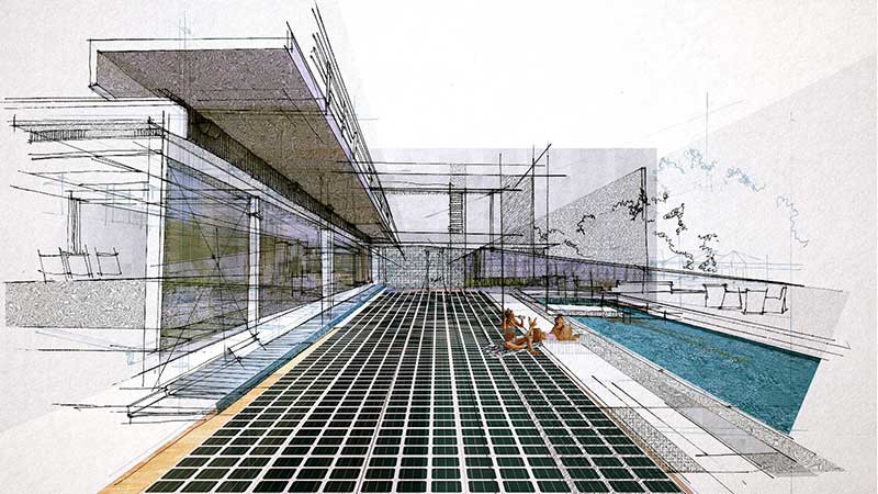 プールサイドに設置されたPowerGroundの使用想定図。国際的な防じん・防水規格の最高クラス「IP68」を取得しているので、安全性は折り紙付き