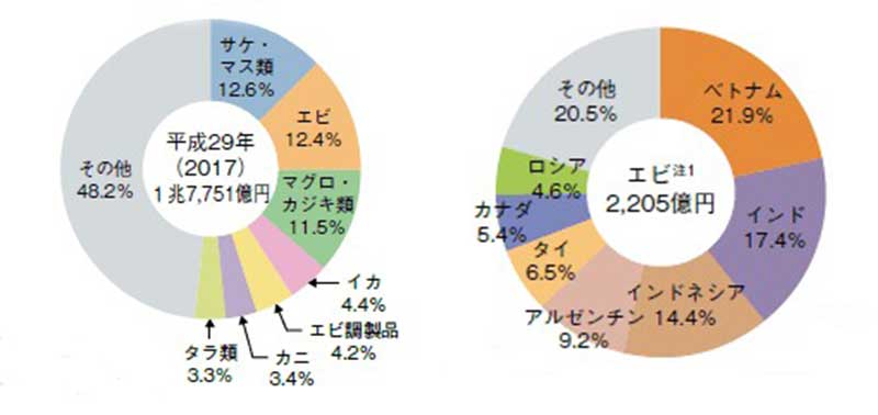 2017年度の水産物輸入品目内訳(左)とエビの輸入相手国・地域(右)。エビ調製品を含めれば、輸入量のトップはエビになる(注1:2205憶円はエビ調製品750億円を除いた数字)