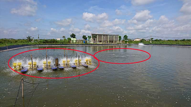 回転することで空気を送る従来のパドル型(左)と今回の実証実験で使われている曝気装置から出た空気(中央付近)