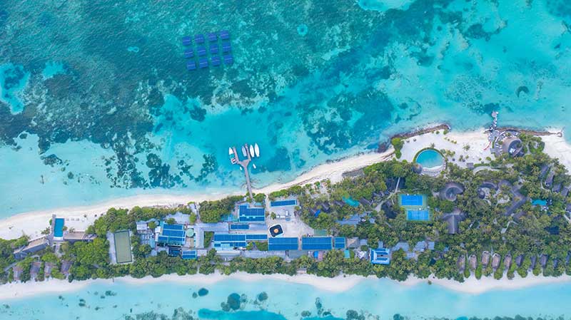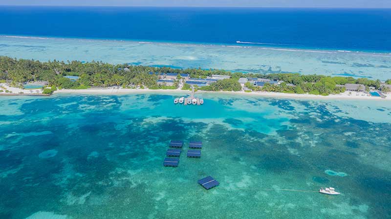 ことし7月には、首都・マーレからスピードボートで約10分のディッドゥフィノール島に世界最大級の浮体式洋上太陽光発電ユニットを敷設。同島のリゾートホテル「LUX* South Ari Atoll」の屋根にはSwimsol社の一般的な太陽光発電(487kWp/キロワットピーク)も備えており、12個のSolarSea(191kWp)を加えた合計は678kWpに。