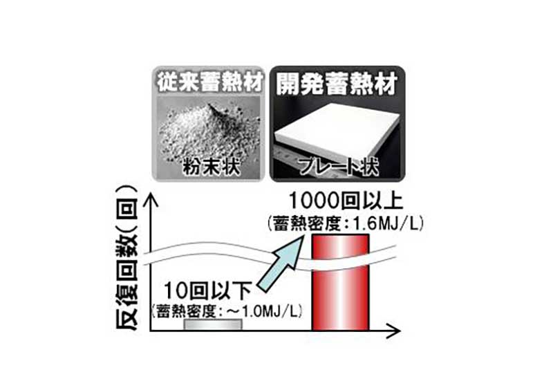 そこで開発されたのが、数千回の反復利用を可能にする今回のプレート。蓄えた熱を使いたいときに繰り返し利用できる技術を確立し、工場での実証実験にまでこぎつけた。また、プレート状にしたこの新しい蓄熱材は、1リットルあたり1.6メガジュールという高い蓄熱密度を持つのも特徴だ。