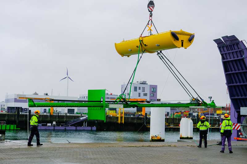 オーステンデ市沖に設置された際の様子。このあと船で沖合まで運ばれ、下部構造が固定された