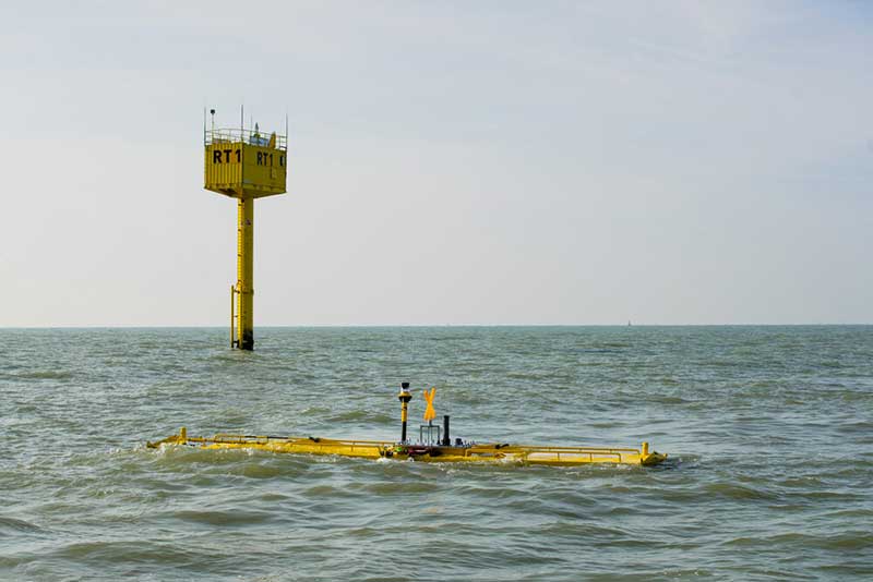 ことし10月、ベルギーのオーステンデ市沖500mに設置されたのは、同社の新型プロトタイプ。幅16mの下部構造と8×2(m)の浮体から構成された、画期的な波力発電機だ。