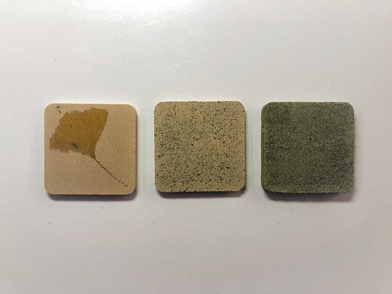 それぞれ、コンクリートと杉を1:1で混合(左)、コンクリートと杉、お茶殻を2:1:1で混合(中)、コンクリートとお茶殻を1:2で混合(右)して作られたリサイクルコンクリート