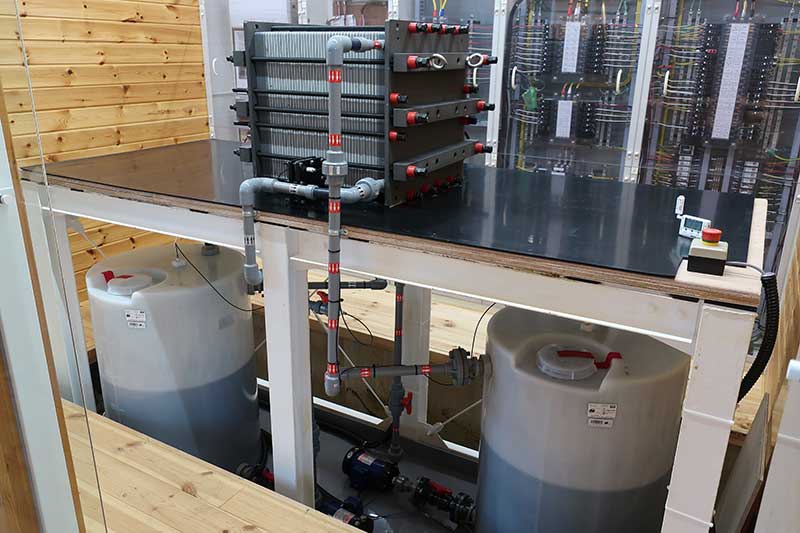 新たに設置されたRFB。上部がセルスタックで、下部に見えるのがタンク。基本的には、タンクにためる電解液量によって電池の容量が決まる