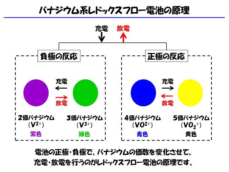 バナジウム系RFBの原理(上)と全体の仕組み(下)。バナジウムは価数という化学状態の変化で、電気をためるための化学反応に利用できる