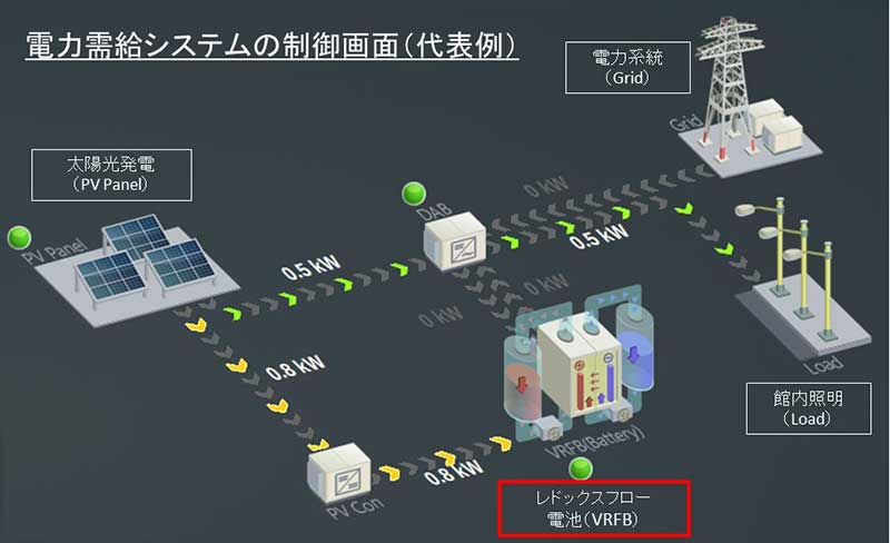 このシステムに接続されるのが、大学内に設置された出力3.1kWの太陽光パネル。太陽光発電で得られた電力は大学内のLED照明に使われ、その余剰分がRFBに蓄電される仕組みだ。また、電力系統からの充電にも対応している。
