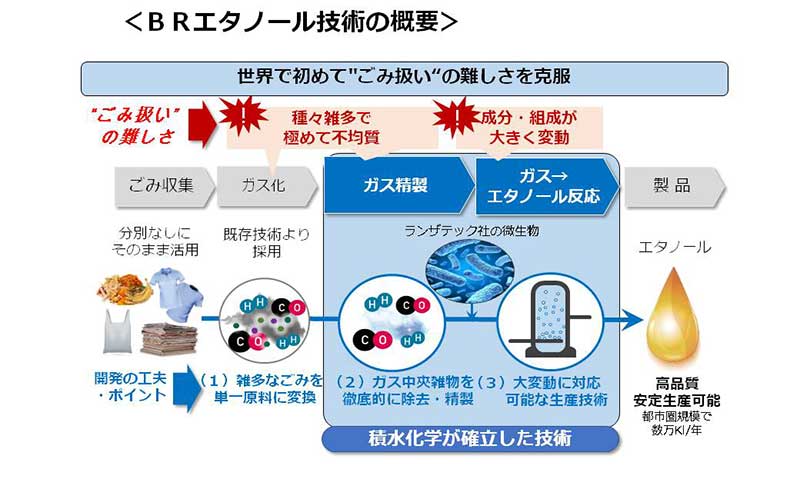 ここに着目した積水化学工業は、協力を仰いだ民間のごみ処理施設の構内にパイロットプラントを建設。LanzaTech社との3年にわたる共同研究の末、可燃性ごみをエタノールに変換する技術を2017年12月に世界で初めて確立した。