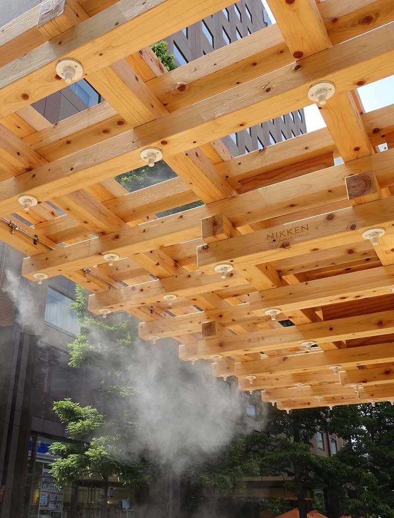 この原理を応用し、街中や観光スポットで導入される機会が増えているのが微細ミストだ。服や肌に触れてもぬれないほどの細かい霧状の水を空気中に散布することで気化熱を発生させ、周辺の温度を低下させている。
