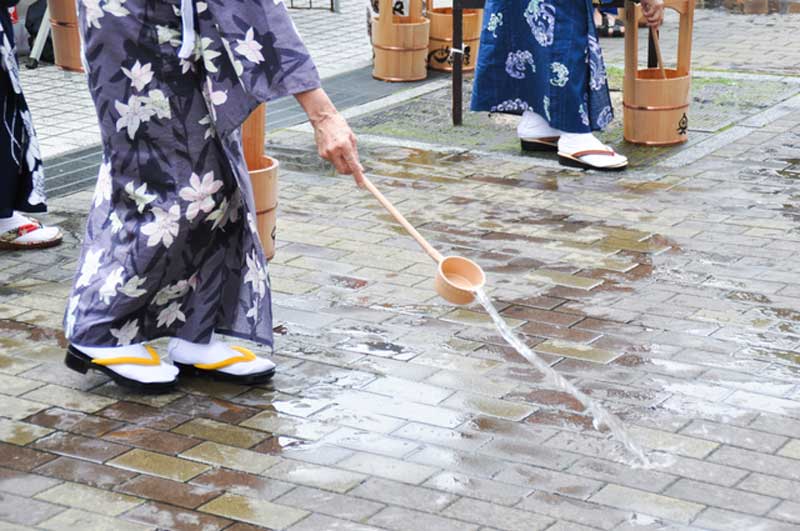 お風呂の残り湯や雨水を再利用することが推奨されている打ち水。道路が舗装される前は、土ぼこりを防ぐ役割も併せ持っていた