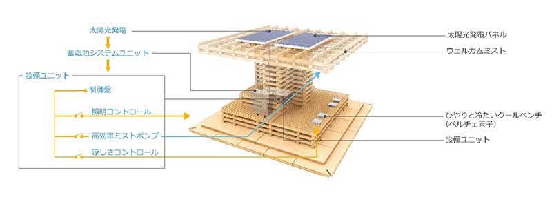 微細ミストのほか、ペルチェ効果を利用した「クールベンチ」で涼をとれる点もCOOL TREEから継承されている。