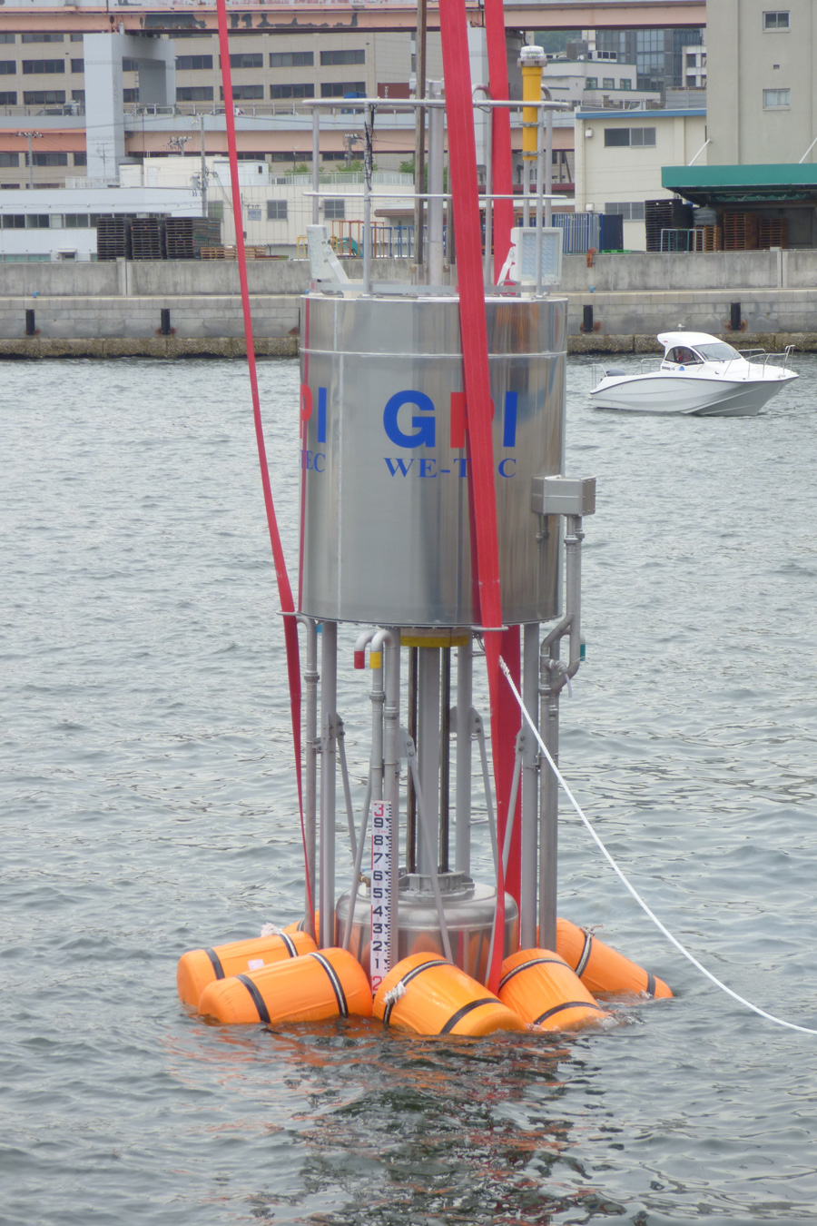 プロトタイプのGPI。ロゴが入った上部の円筒状部分はギアや発電機を収めたユニットで、その下に繋がっているフロートが波の動きに合わせて動くことで発電する