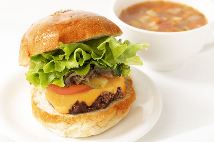 「シルクバーガー」と、ミネストローネにシルクフードを取り入れた「シルクスープ」のセット1100円(税込)