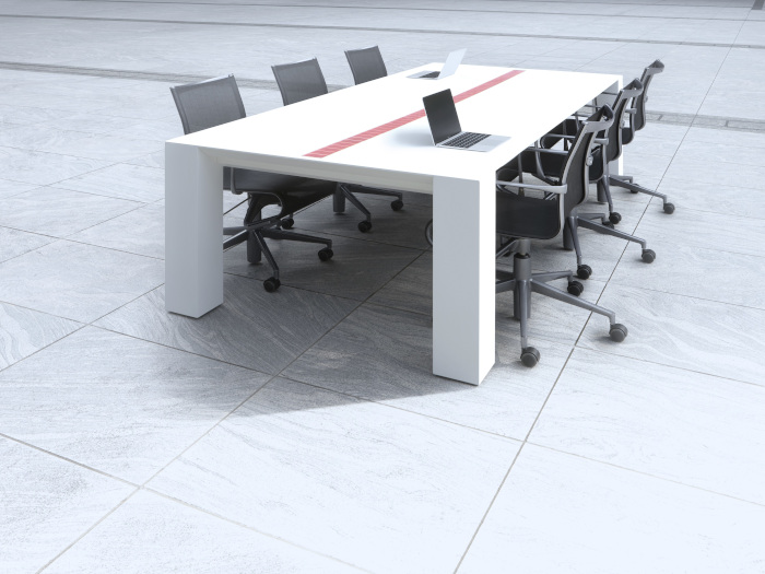 大成株式会社と株式会社デザインオフィス ラインが手掛けた「LOOPLINE T1」。天板上の赤いラインがリコー製の固体型色素増感太陽電池。デスクは3サイズで販売されており、最大サイズには48個の太陽電池が搭載されている