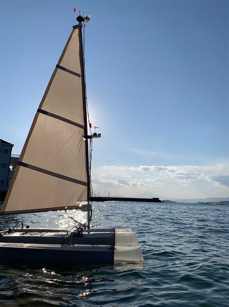 これらの技術を駆使し、2019年に全長1m級クラスの帆船の製造を開始。ことしに入り、葉山港から江の島間に複数定めた経由地を通り、約7kmを自然風のみで自動航行することに成功した。