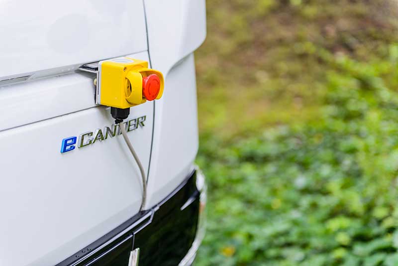 世界初の量産小型EVトラックをベースにしたゴミ収集車。ベースとしたeキャンターは、1度の充電で約100kmの走行が可能
