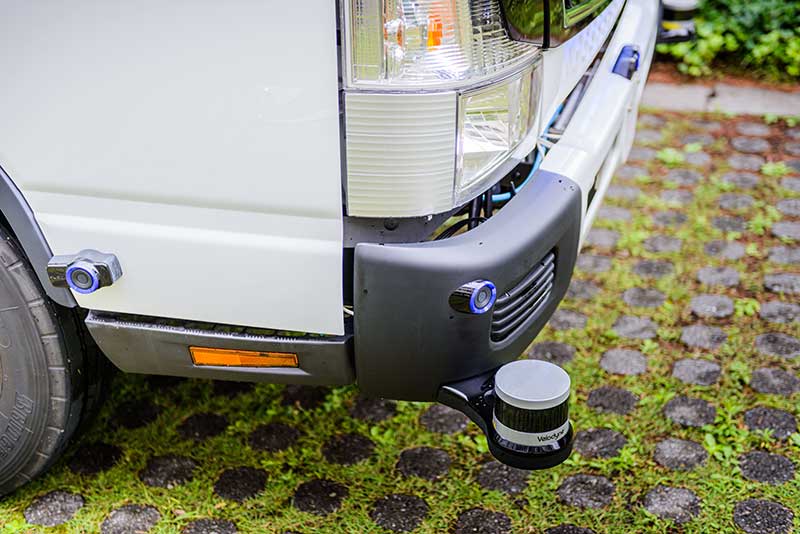 車体右端にLiDAR、その上や右前輪の近くに超音波センサーが見える。安全確保に欠かせない