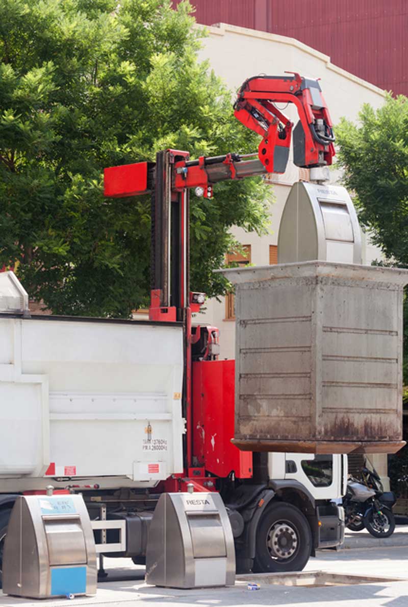 海外においてゴミ収集車がゴミを豪快に回収するようす