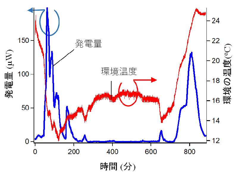 すると、朝や夕方など、大きな温度変化が生じる際に比例して発電量が得られることを実証。同時に、環境変化による温度差のみでIoTセンサーを動かすことにも成功した。