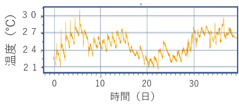 建物内部の温度変化で発電した電力を用いて温度データを39日間にわたって測定した結果。バッテリーレスでIoTセンサを長期間動作できることを示している