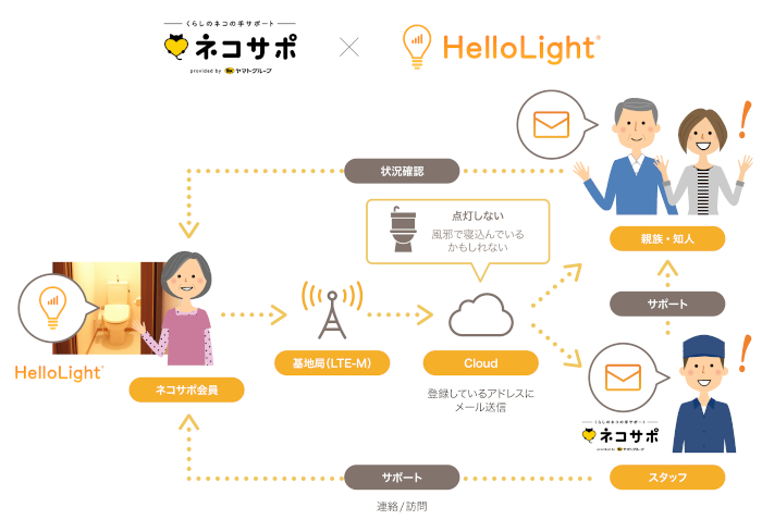 今回の実験では、日本中で荷物を配送するヤマト運輸の人的リソースをベースに、「HelloLight」を活用することで、これまでできなかった遠隔による見守りが実現できた。