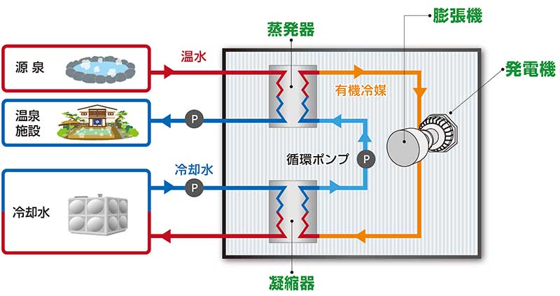 また、ORC発電に使用されたお湯は適度に冷まされた状態で入浴施設に供給されるため、無駄が生じることはない。タービンを回した蒸気も凝縮器で冷却されて液体に戻ることで、再利用される。