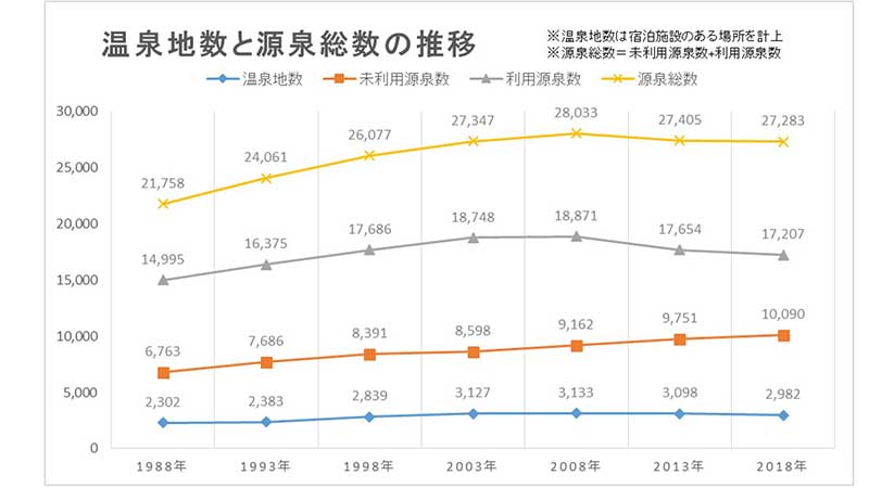環境省のデータを基に作成。未利用の源泉数が増加傾向にあるのが気になるところ