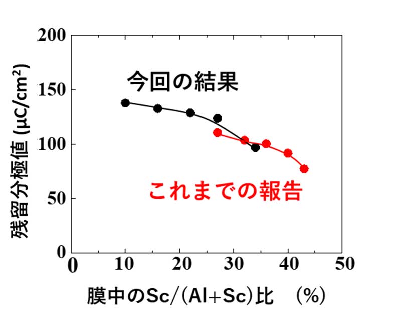 そこでまず突き止めたのが、物質中のSc比を小さくすることで、電源を切り離したときに物質に残る1cm角あたりの静電容量(残留分極値)が大きくなることだ。