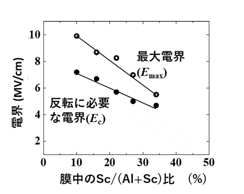 また、Sc比が小さいほど、別の分極状態に反転させる際に必要な電圧と、物質に加えることができる電圧(いずれも1cmあたり)に差が出ることが分かった。