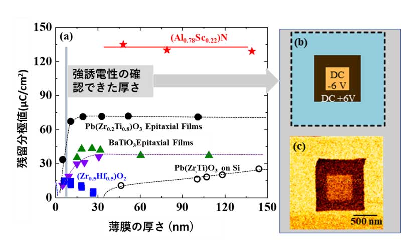 さらに、分極分布をナノスケールで観察できるプローブ顕微鏡を用いた非線形誘電率顕微鏡法で、より薄い9nmでも強誘電性が実現することを世界で初めて実証した。